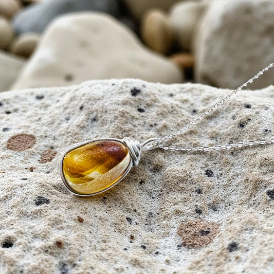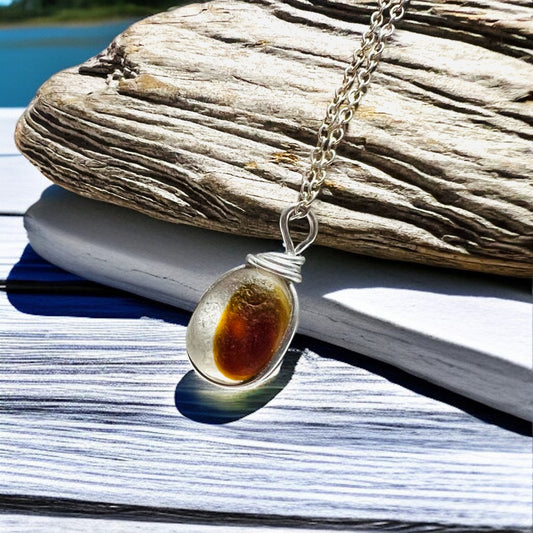 Yellow and Brown Seaham Sea Glass Pendant on a 20” Sterling Silver Chain .