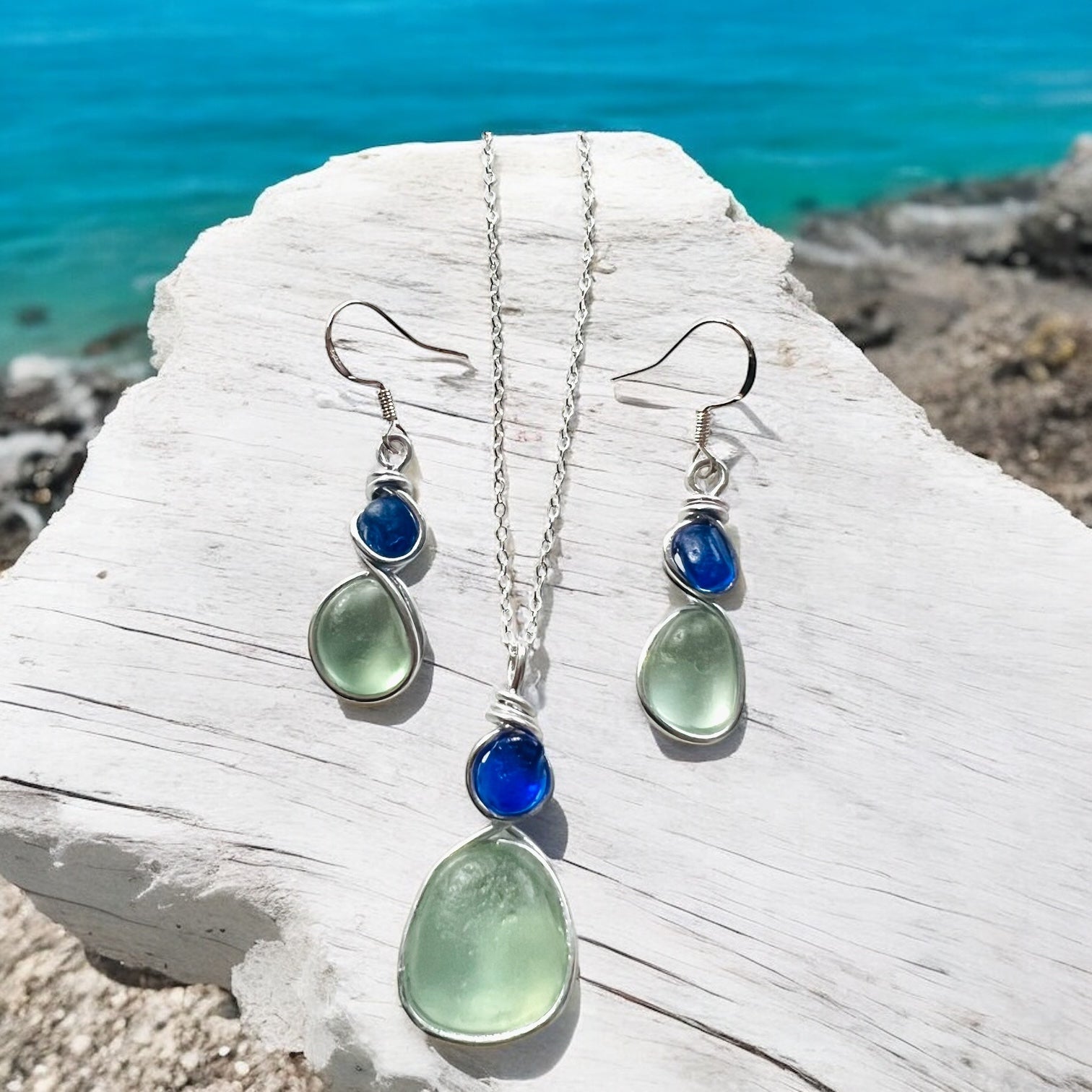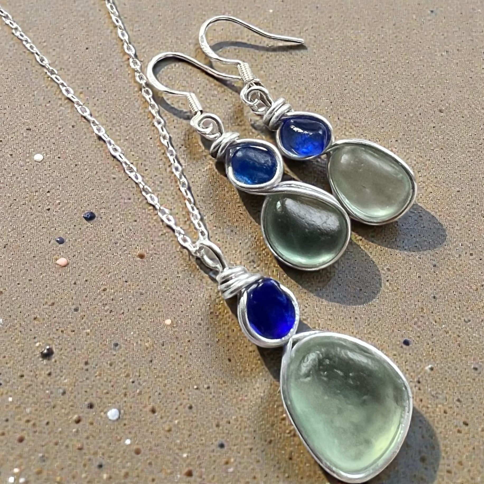 Aqua and Blue Seaham Sea Glass Jewellery Set