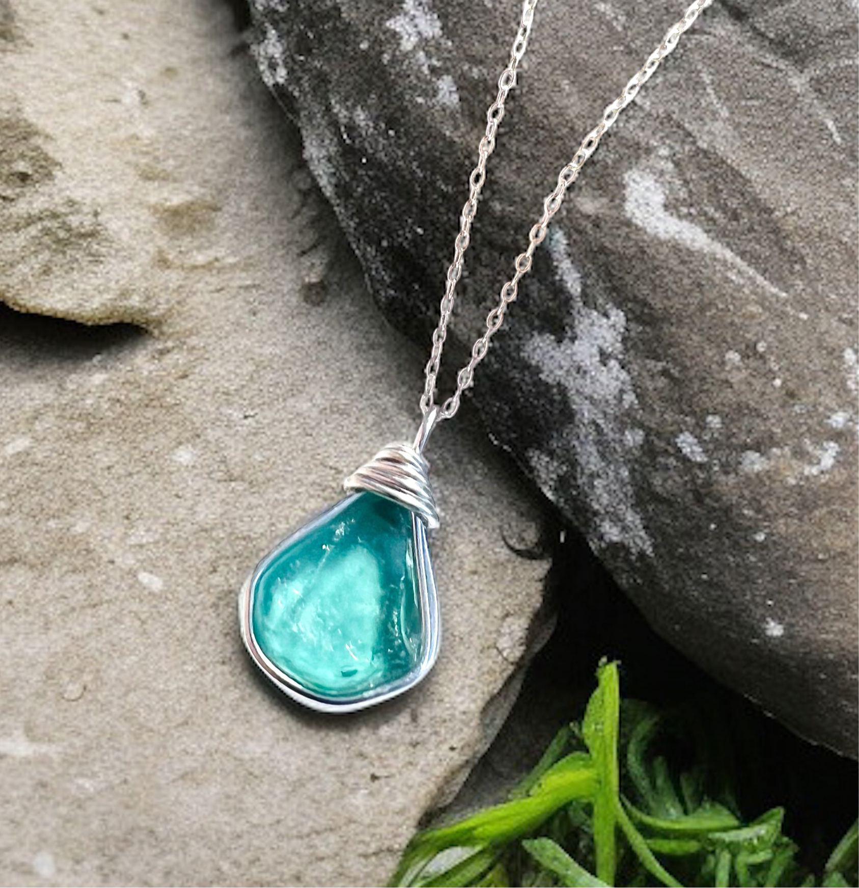 Seaham Sea Glass Aqua Blue Sea Glass Pendant on an 18” Sterling Silver Chain.