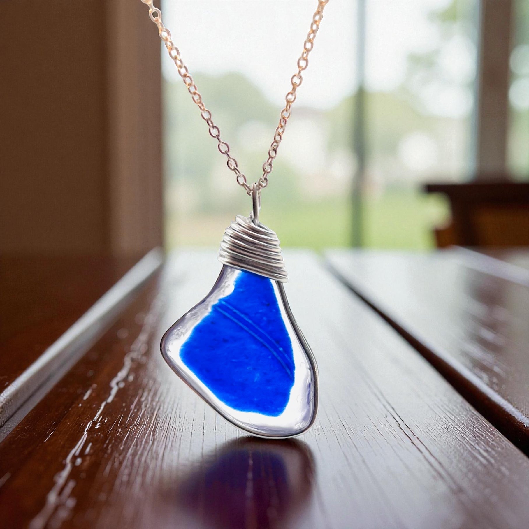 Rare Large Blue and White Sea Glass found in Lanzarote. Handcrafted in wire and set onto an 18” Sterling Silver Chain.