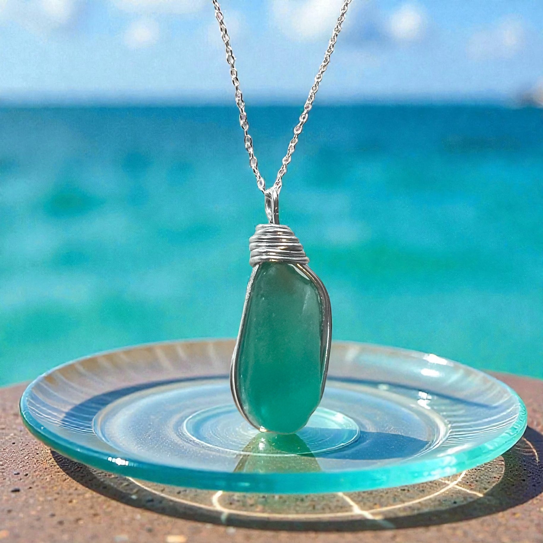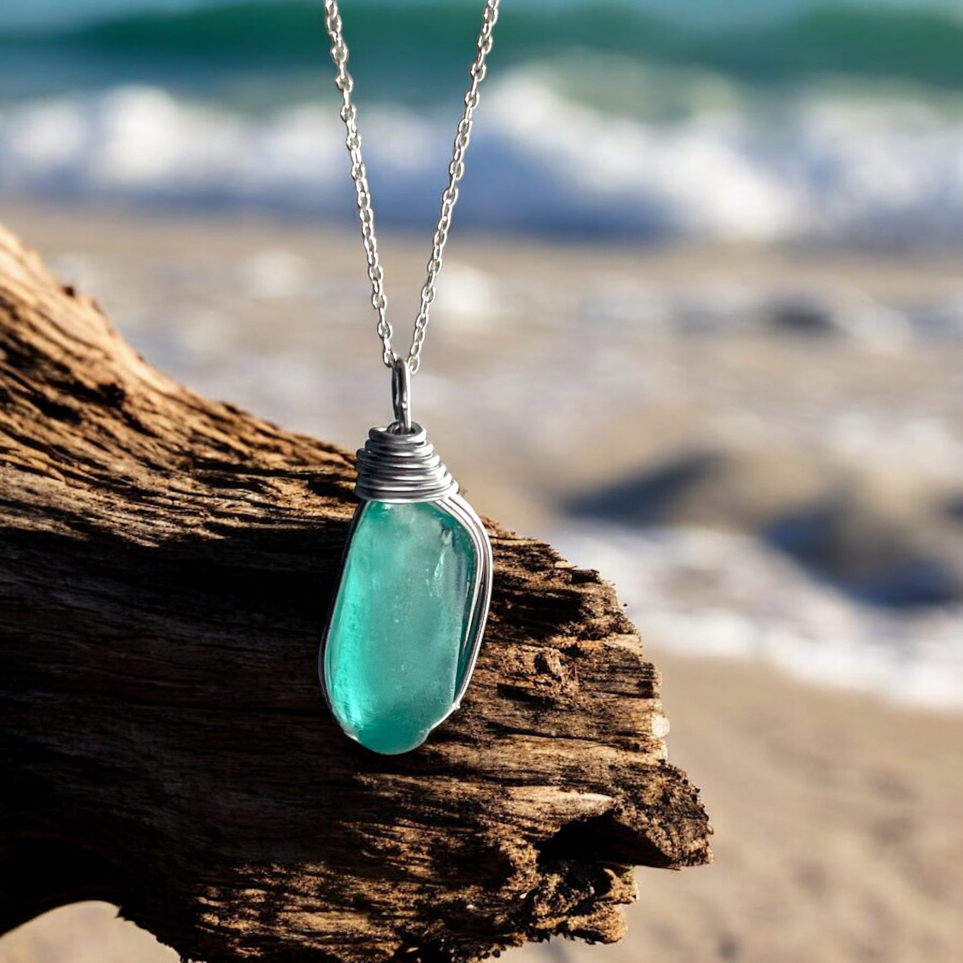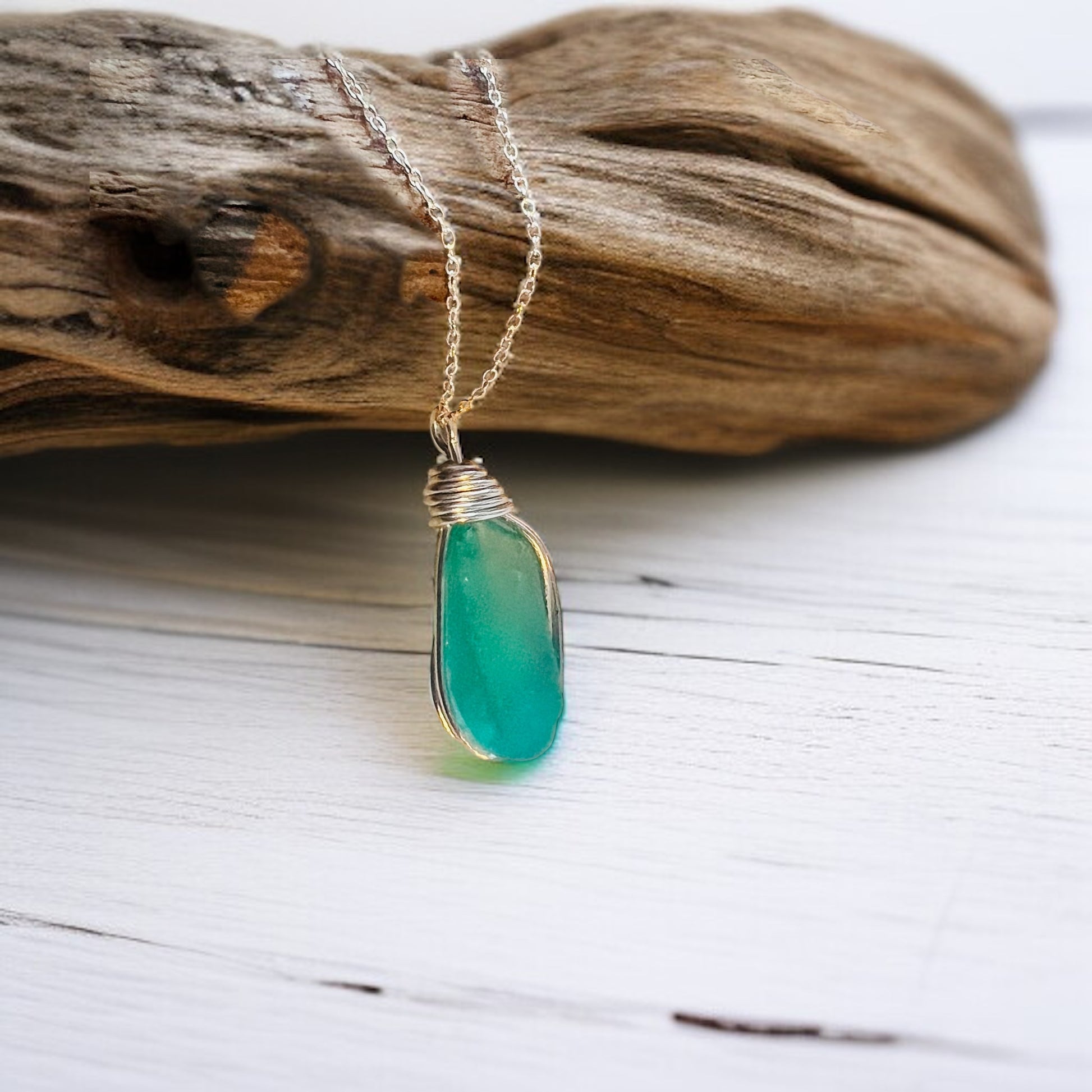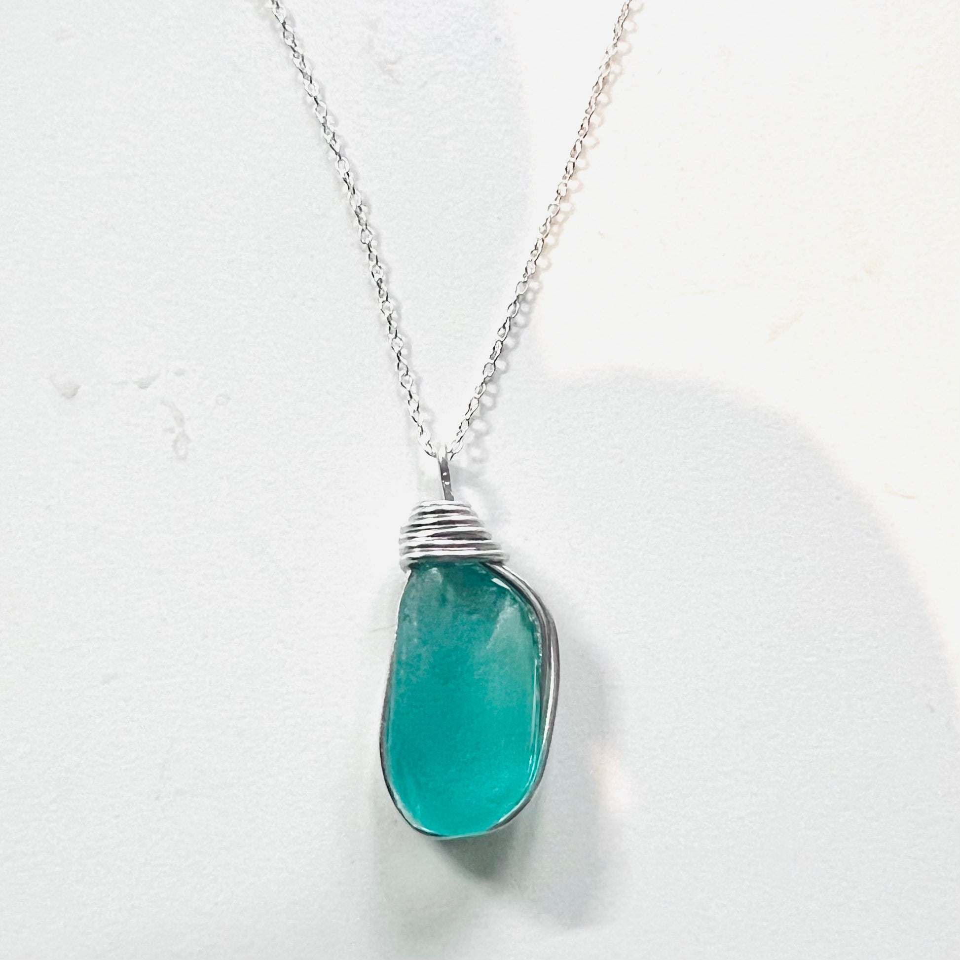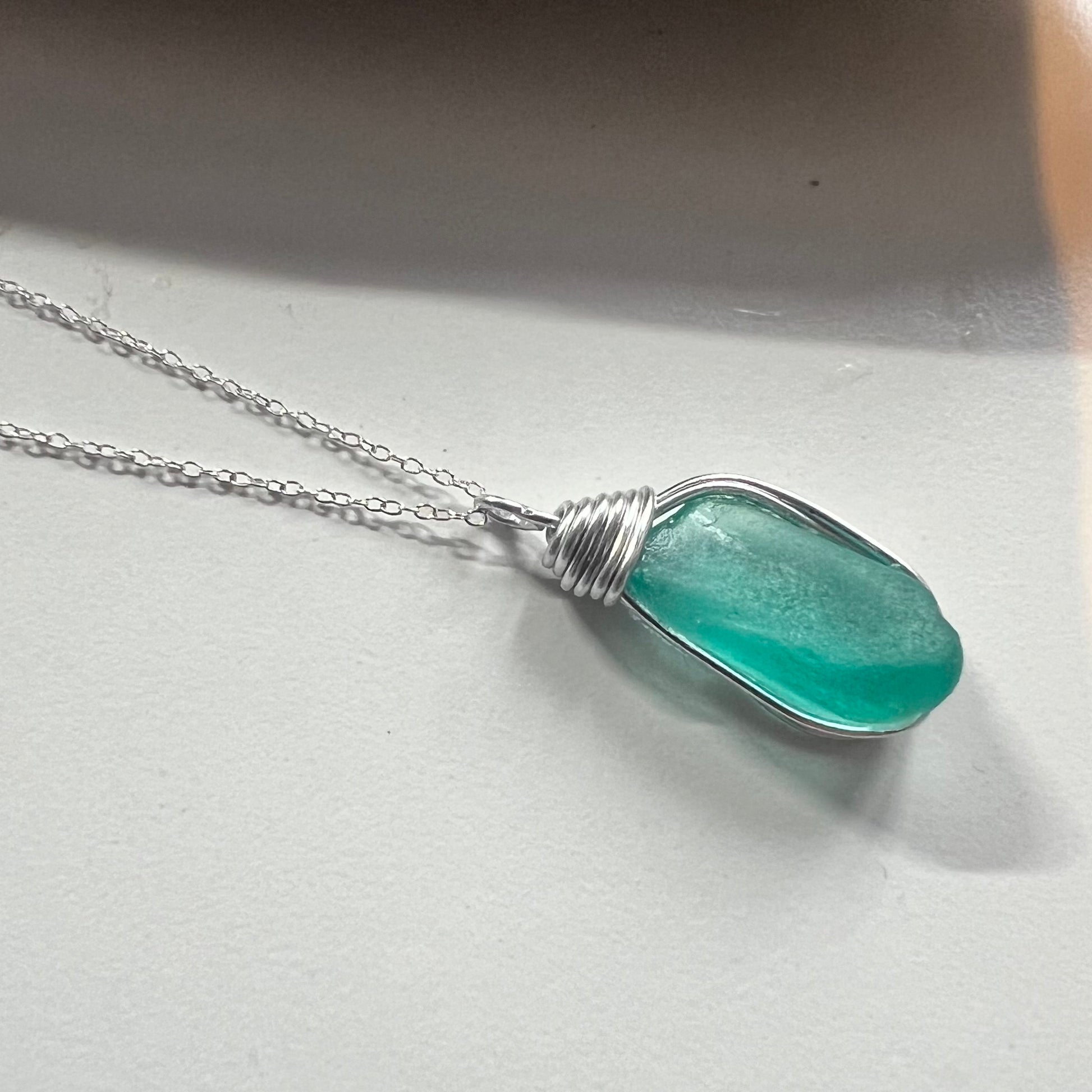 Large Kent Sea Glass Pendant. Handcrafted in wire and set onto a 20” Sterling Silver Chain.