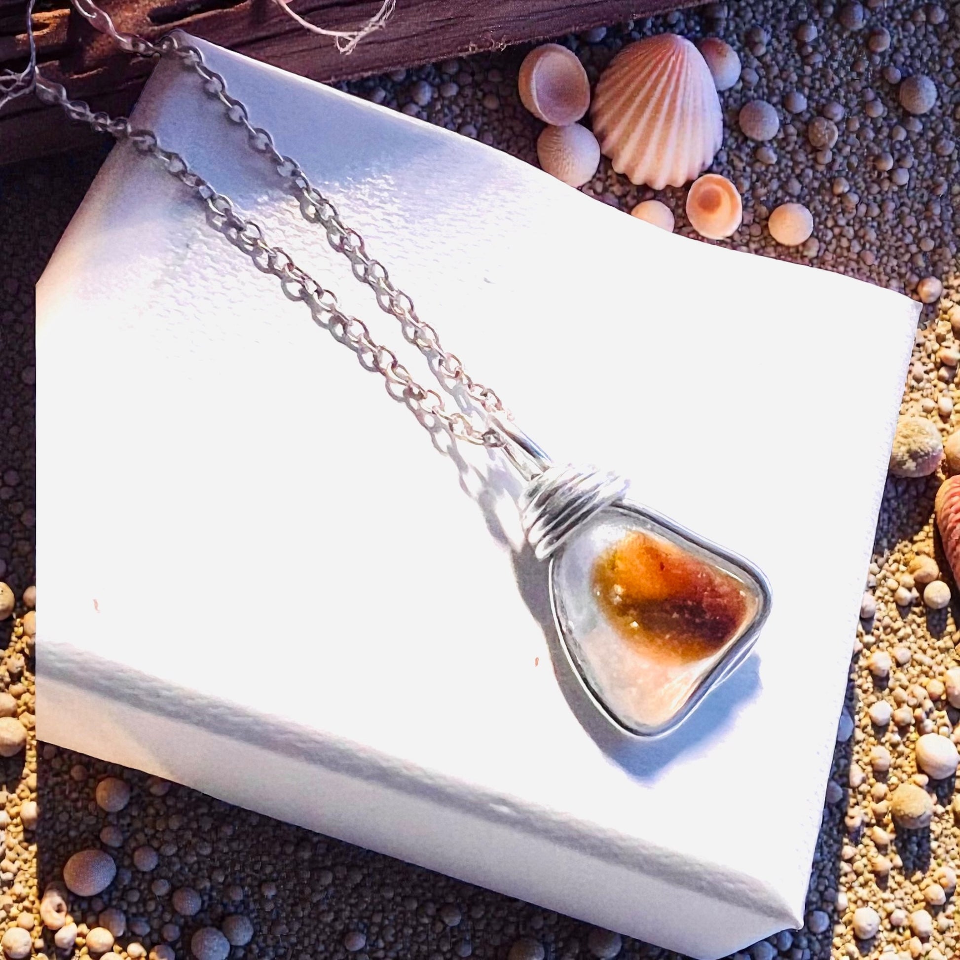 Stunning Piece Yellow and Brown Seaham Sea Glass handcrafted in wire and set onto an 18” Sterling Silver chain. Truly are one of a kind !