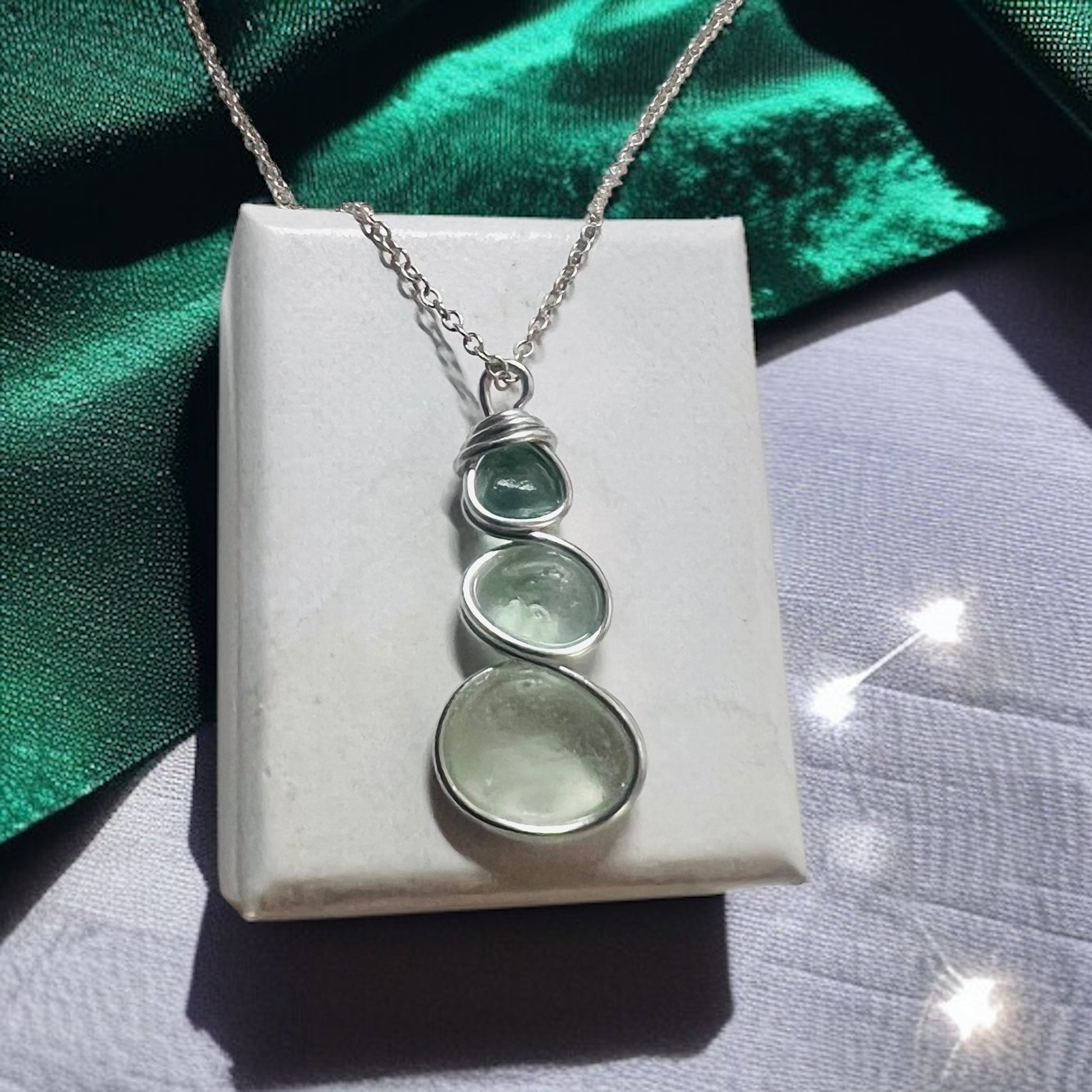 Seaham Sea Glass Three Piece Pendant. Handcrafted in wire and set onto a 18” Sterling Silver chain.