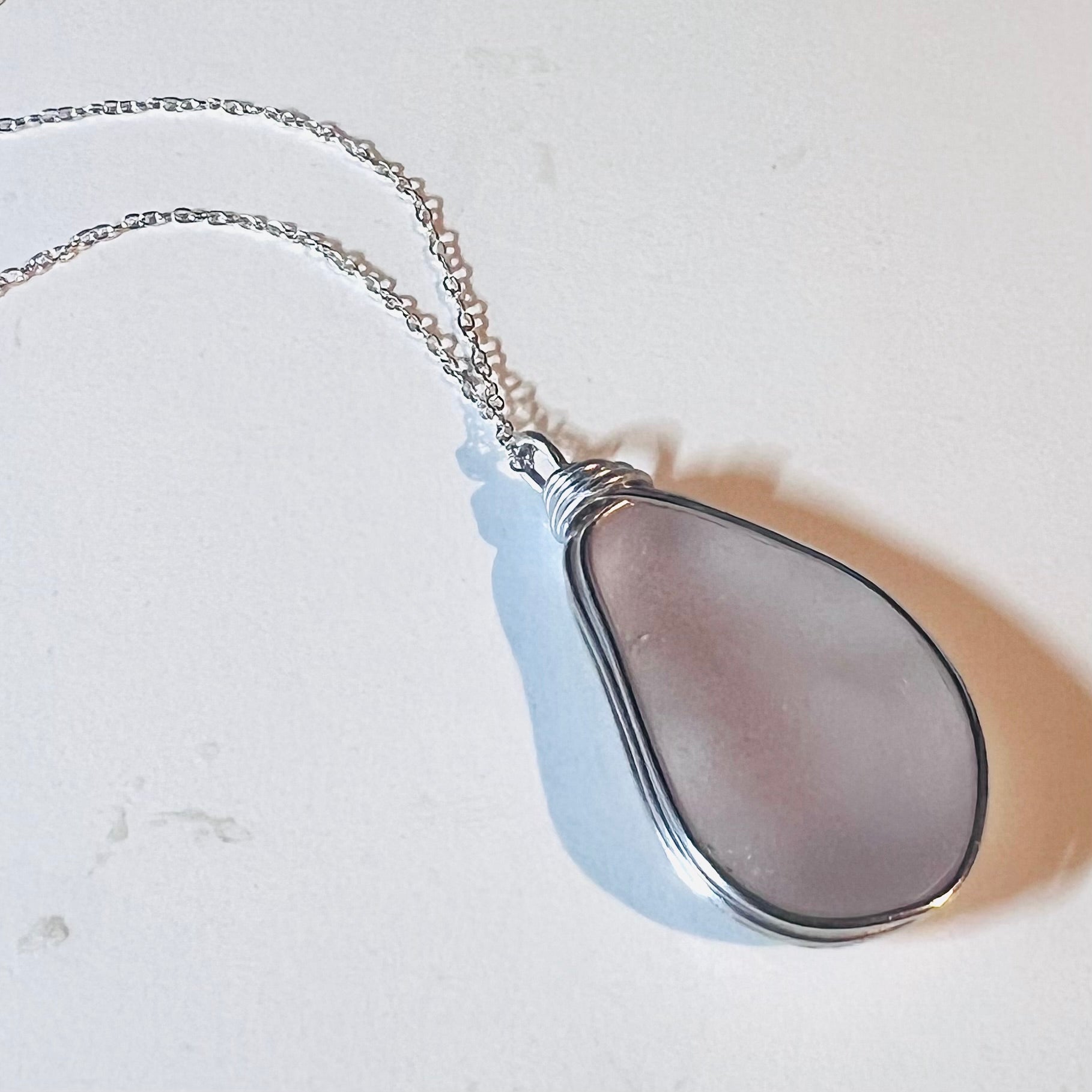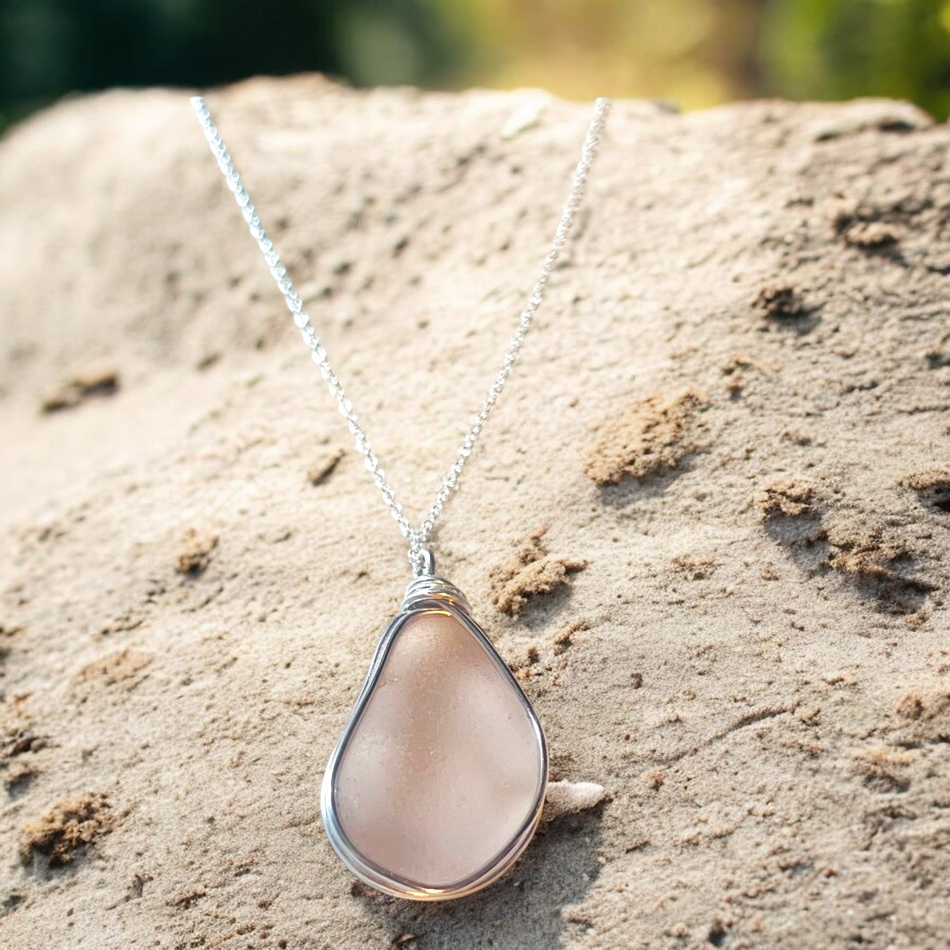 Large Rare Pale Pink Seaham Sea Glass Pendant. Handcrafted in wire and set onto a 18”Sterling Silver Chain.