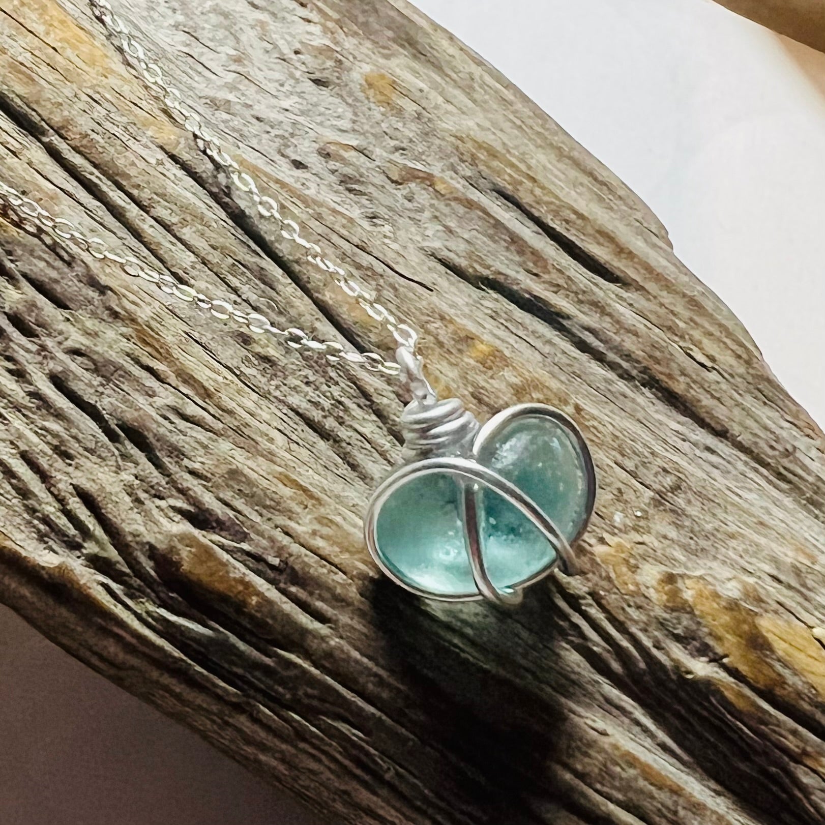 Seaham Sea Glass handcrafted in wire and set onto a 18” Sterling silver chain .