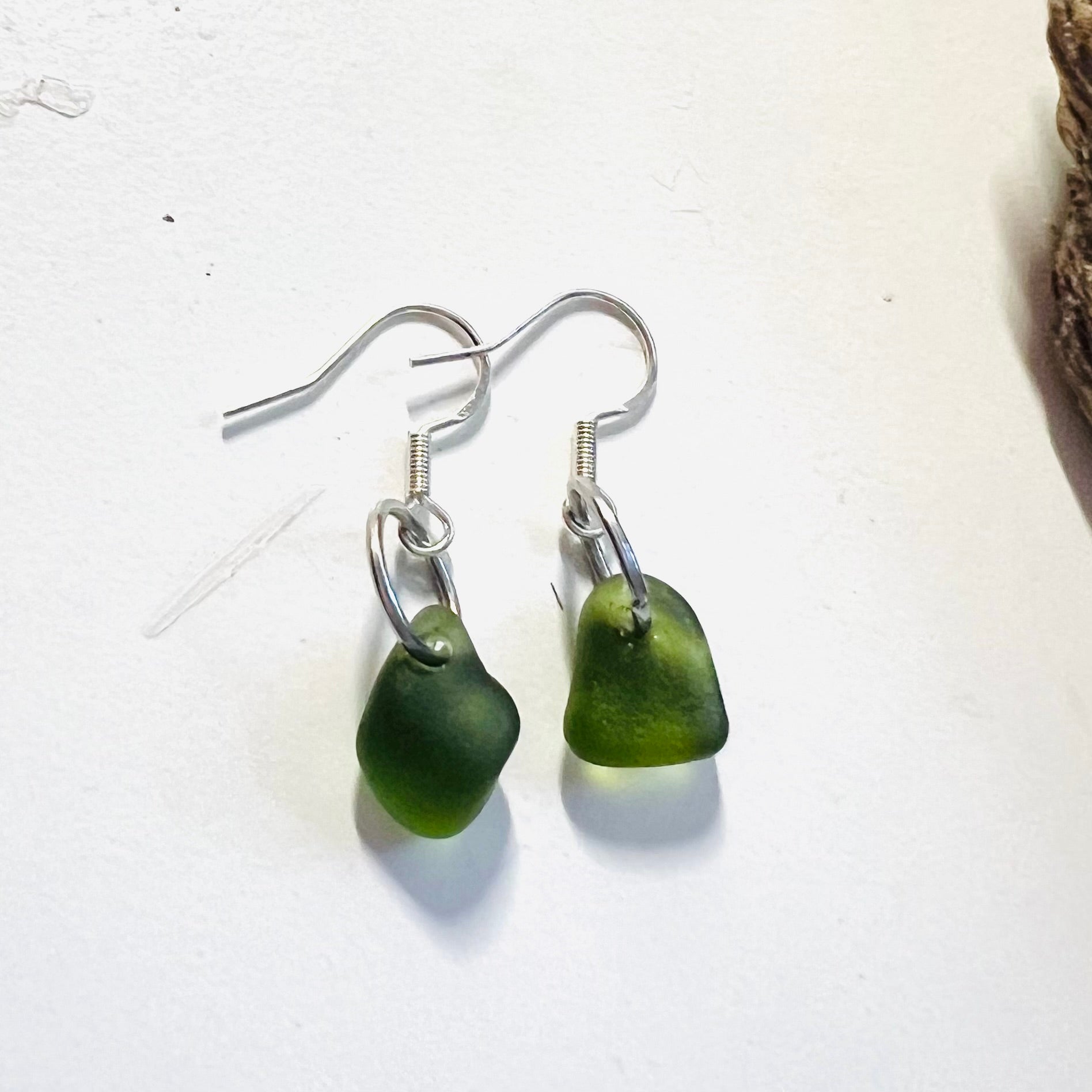 Green dangly Seaham Sea Glass Earrings on Sterling Silver Hooks.