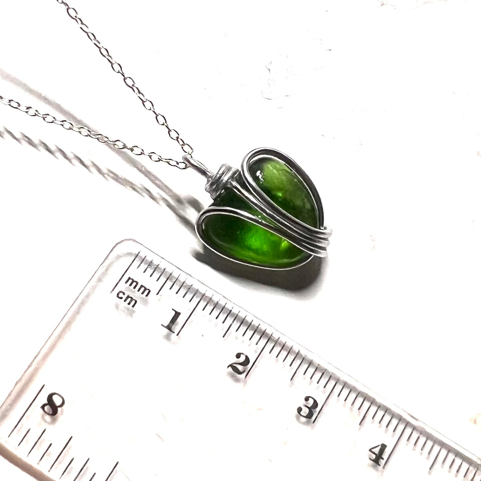 Green Cornish Sea Glass Pendant. Handcrafted in wire and set onto an 18” Sterling Silver Chain.