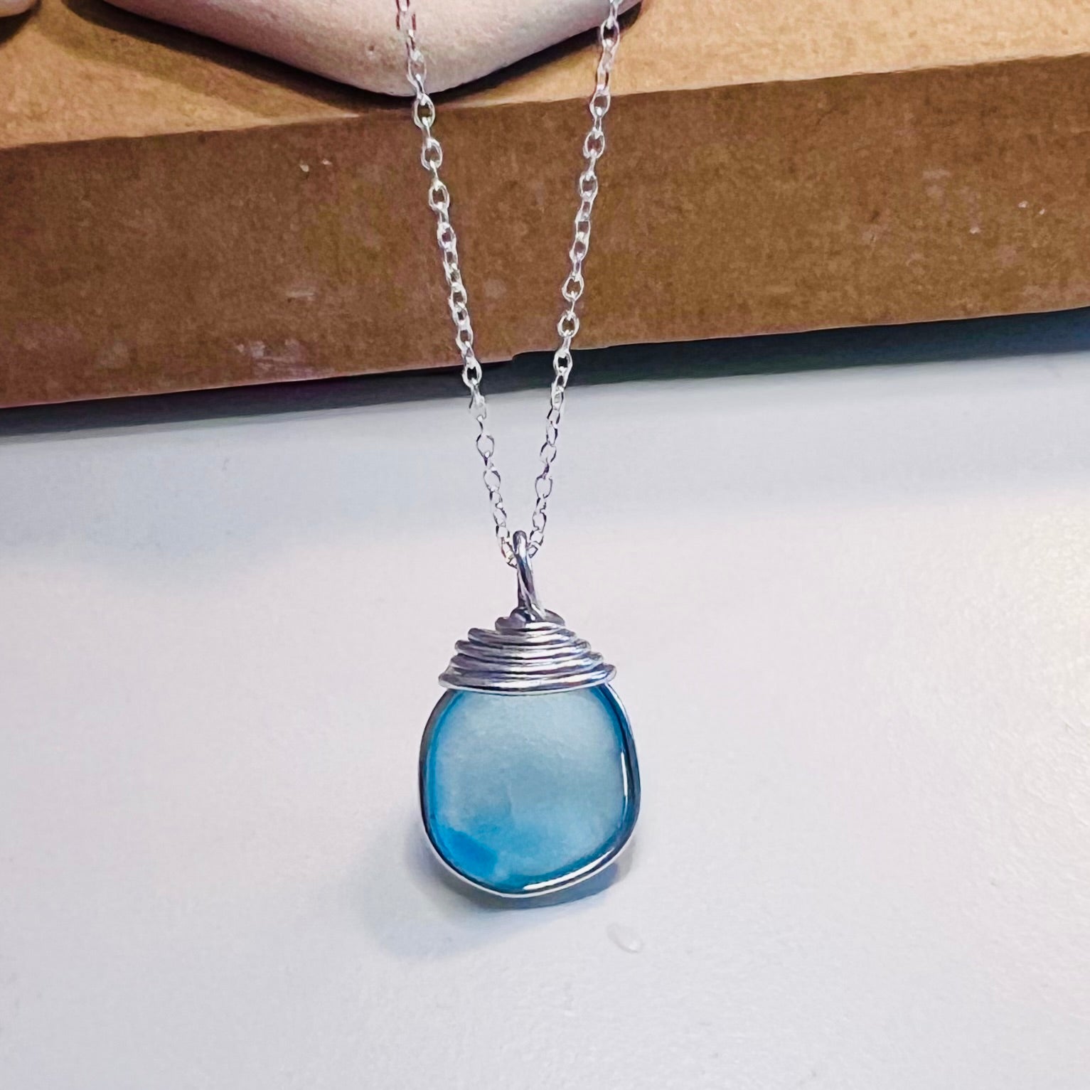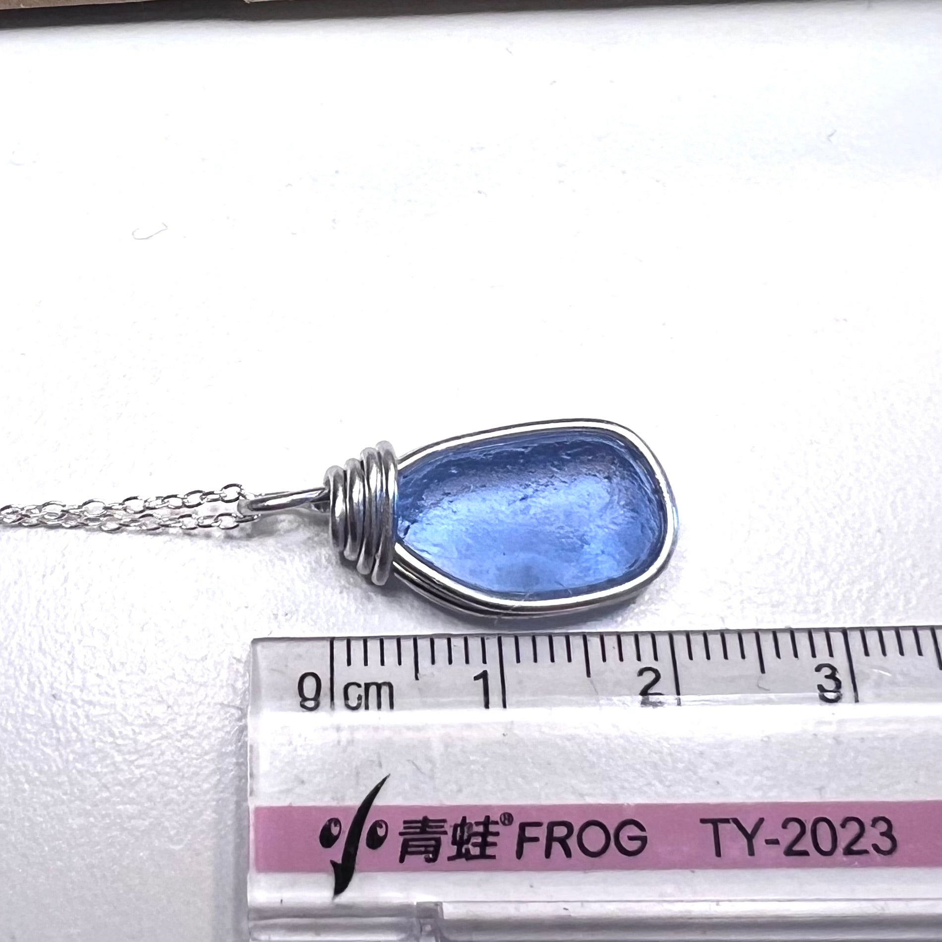 Cornflower Blue Seaham Sea Glass Pendant. Handcrafted in wire and set onto an 18” Sterling Silver Chain.