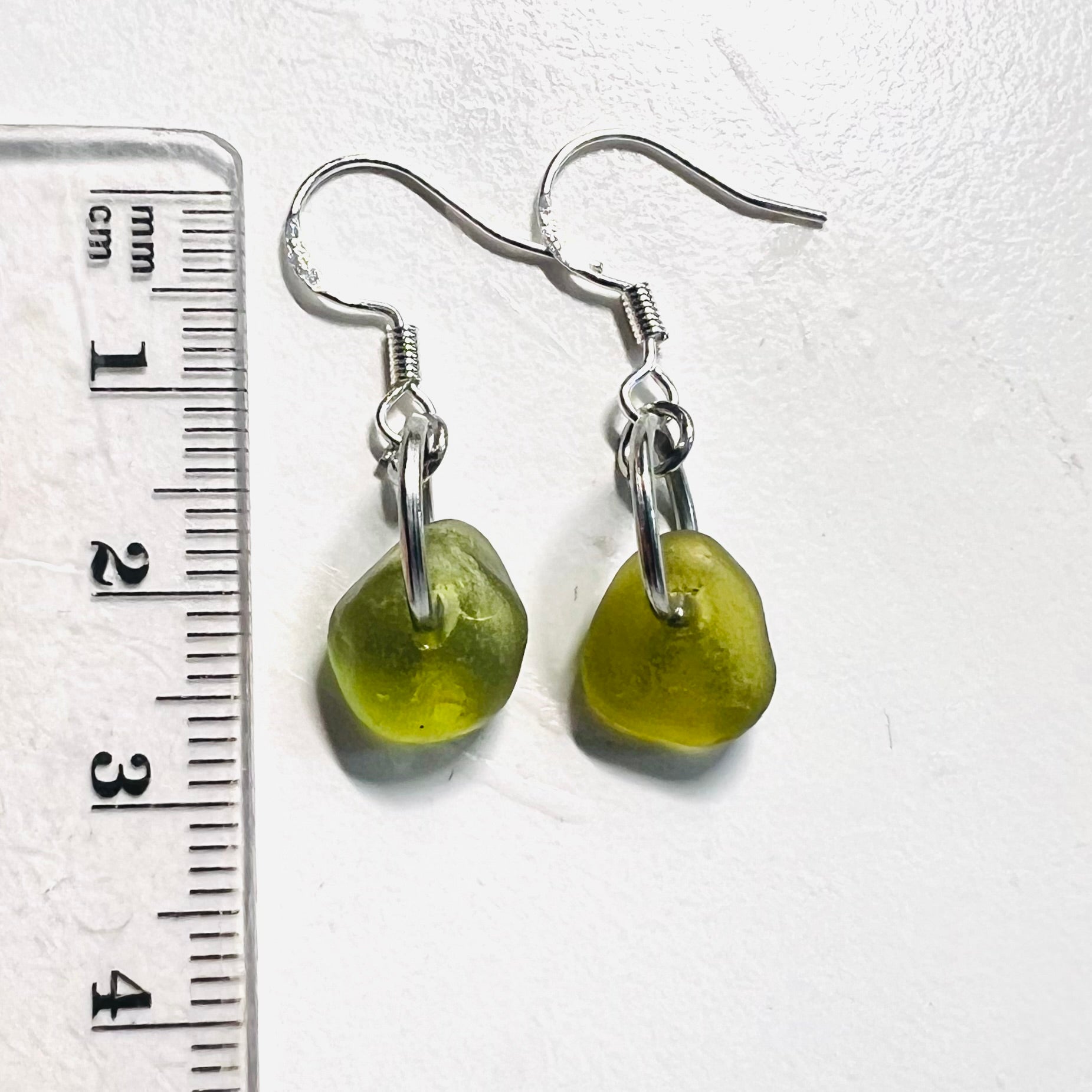 Green dangly Seaham Sea Glass Earrings on Sterling Silver Hooks.