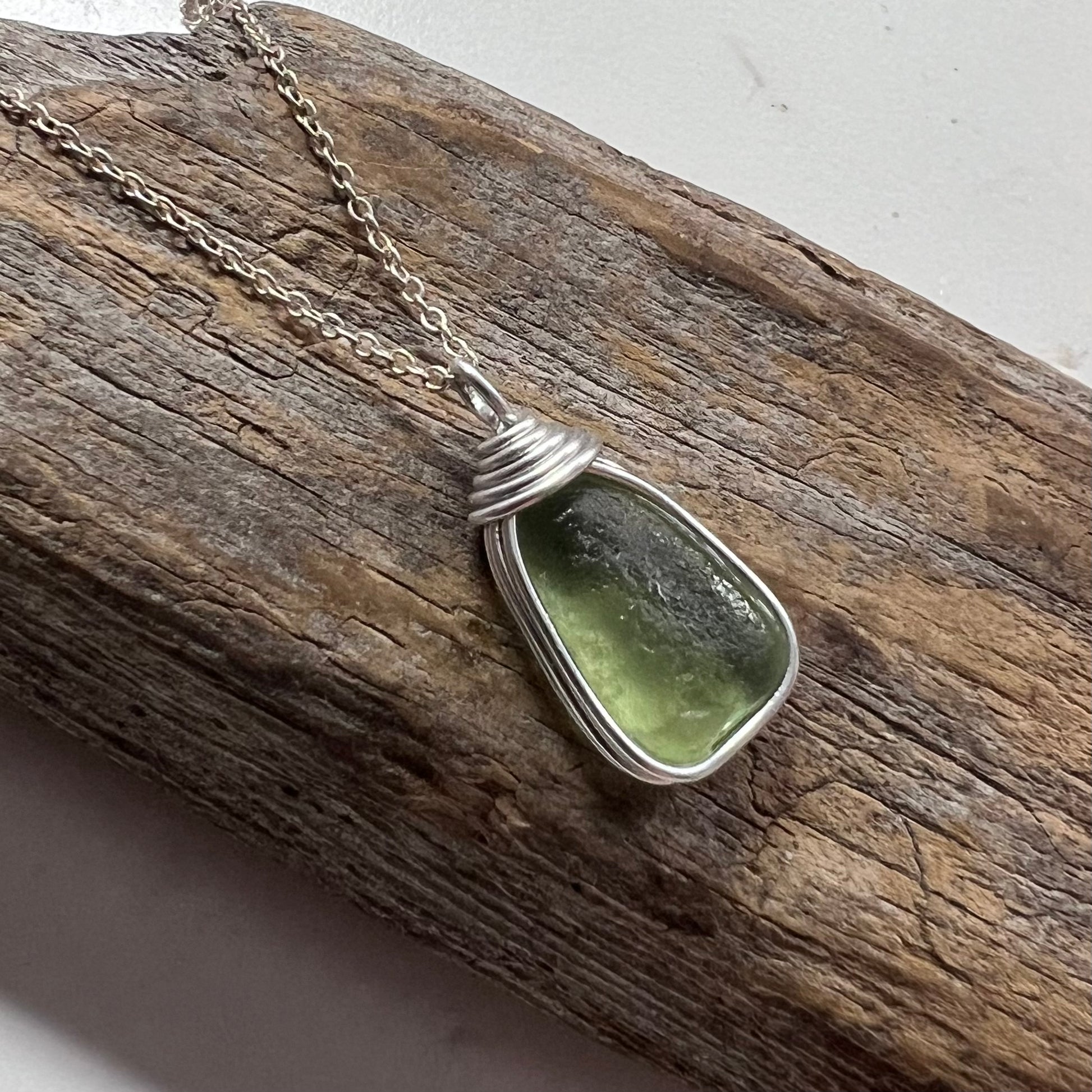 Seaham Sea Glass Pendant on an 18” Sterling Silver Chain with White Glass Pearl detail.