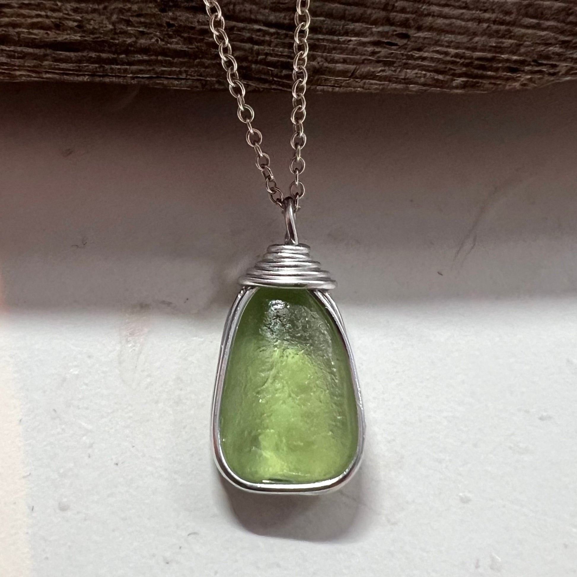 Lime Green Seaham Sea Glass and Glass Pearl Pendant
