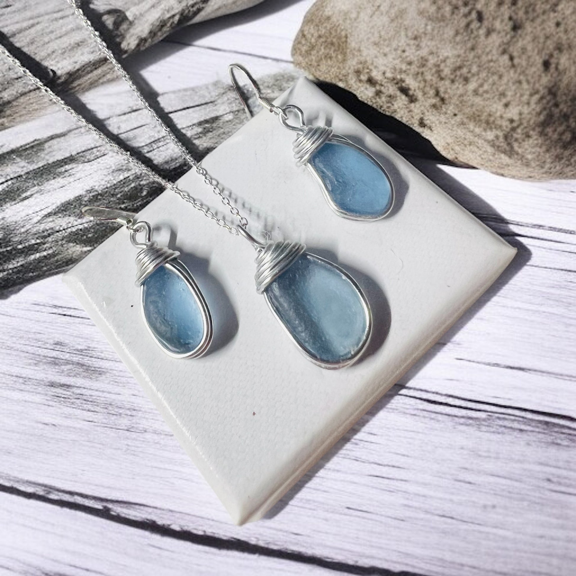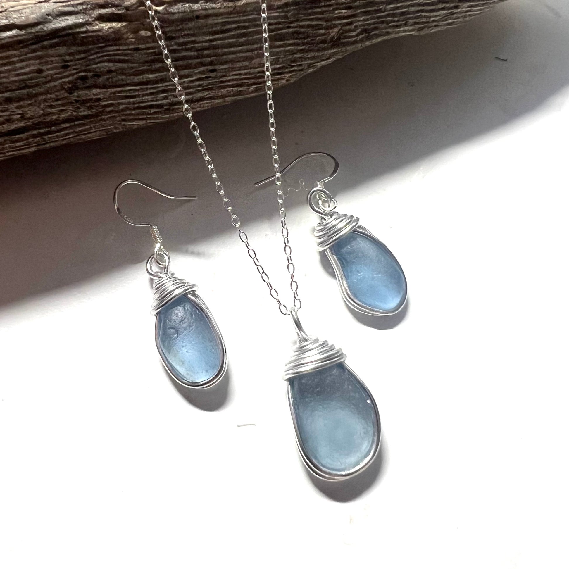 Gorgeous Blue Seaham Sea Glass Pendant on an 18” Sterling Silver Chain. Matching Sterling Silver Earrings .