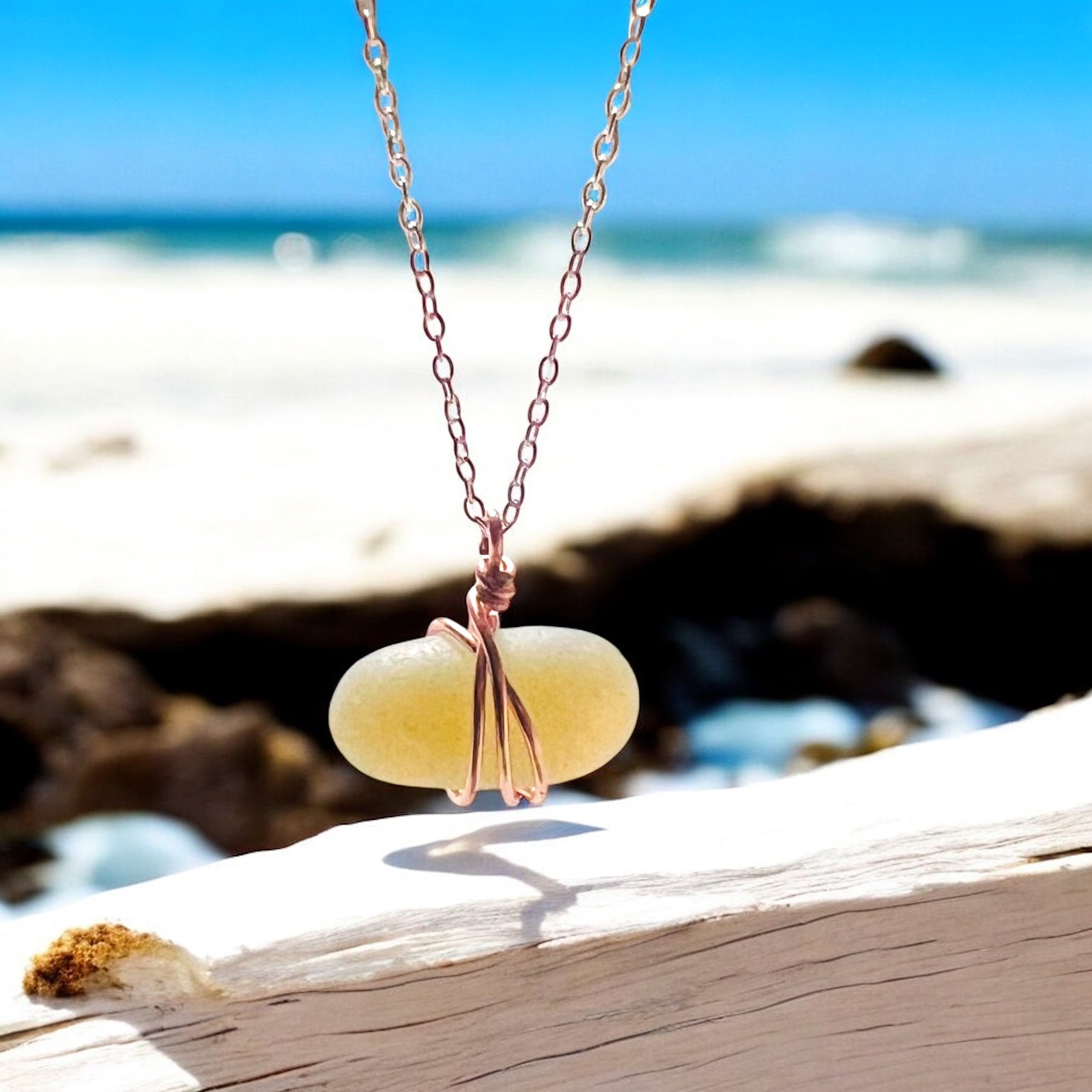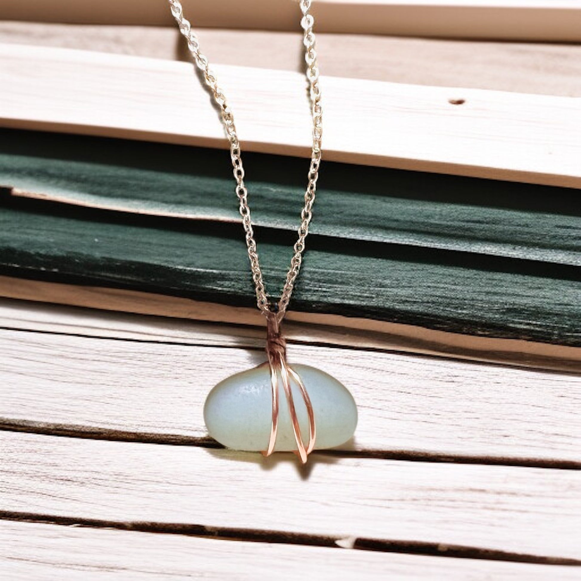 A Beautiful Rare piece of Opalescent Seaham Sea Glass Pendant. Handcrafted in wire and set onto a 18” Sterling Silver Chain.