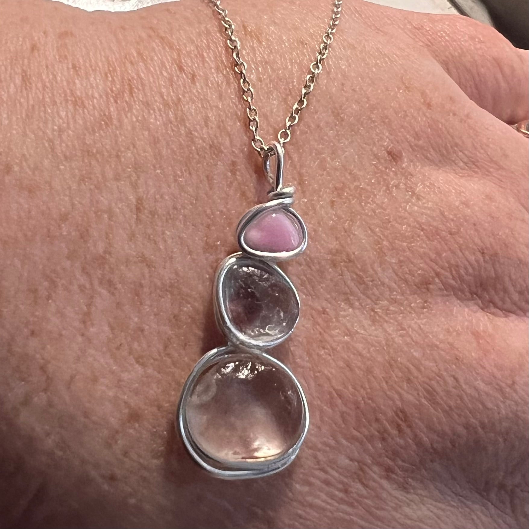 Seaham Sea Glass Three Piece Pendant. Handcrafted in wire and set onto a 18” Sterling Silver chain.