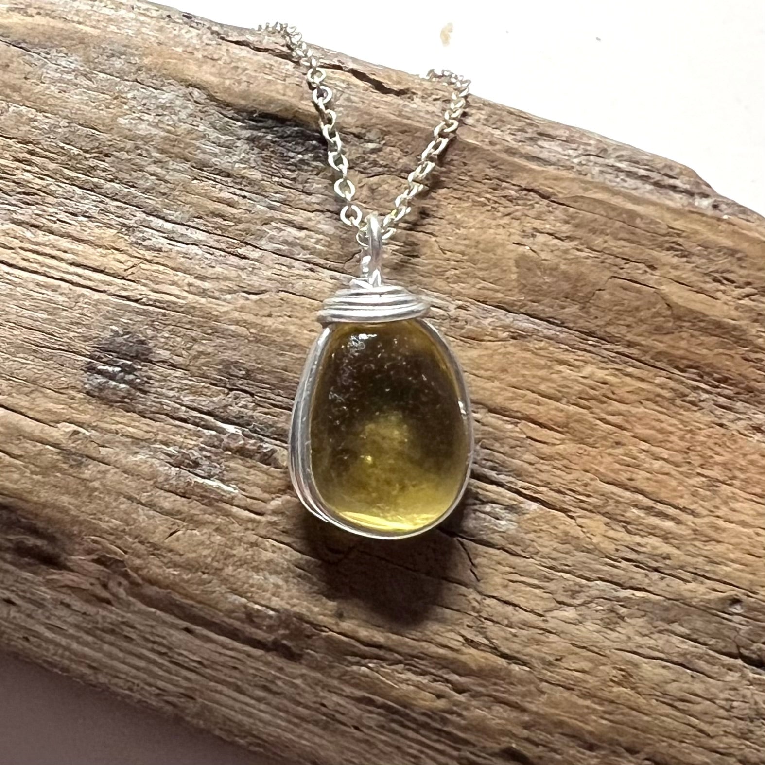 Rare Yellow Sea Glass found in Lanzarote. Handcrafted in wire and set onto an 18” Sterling Silver Chain.