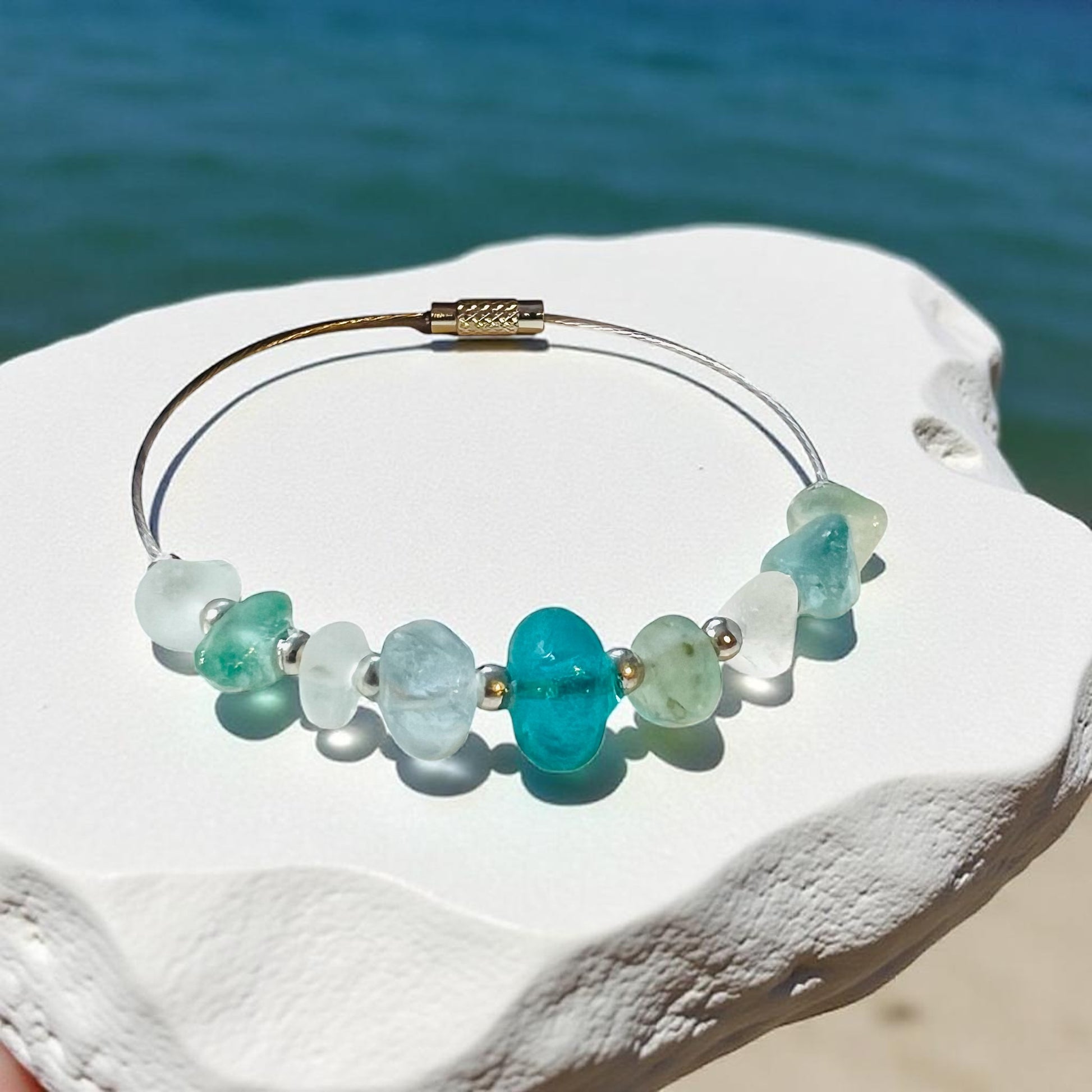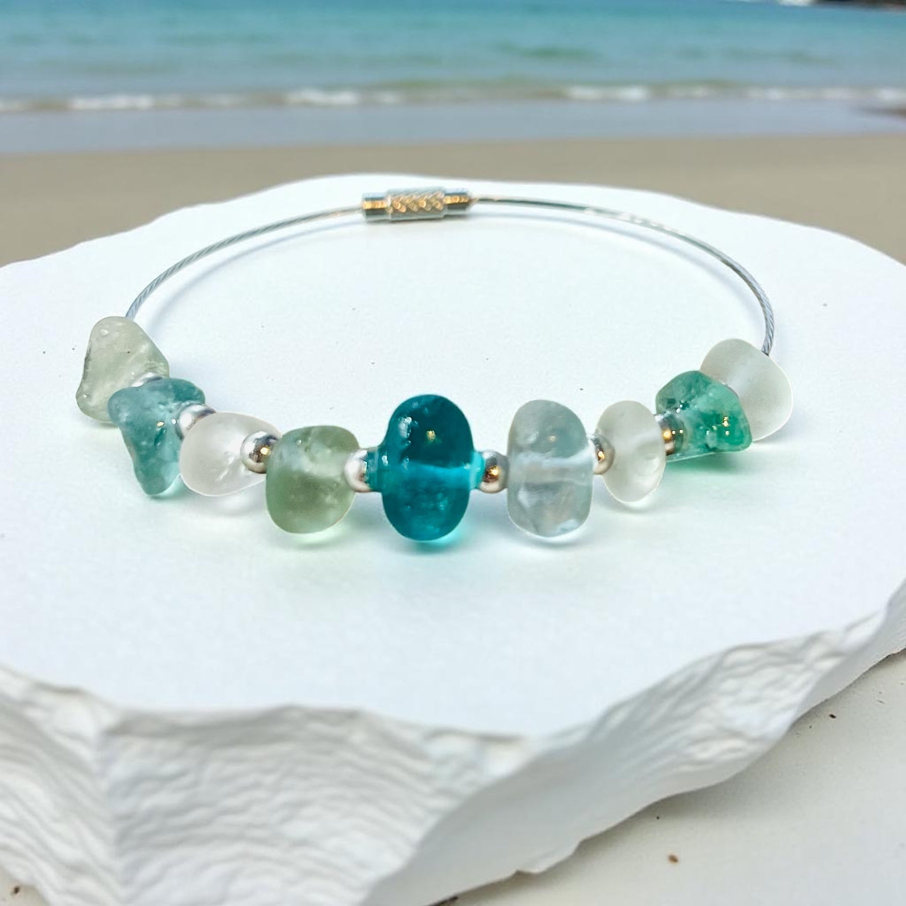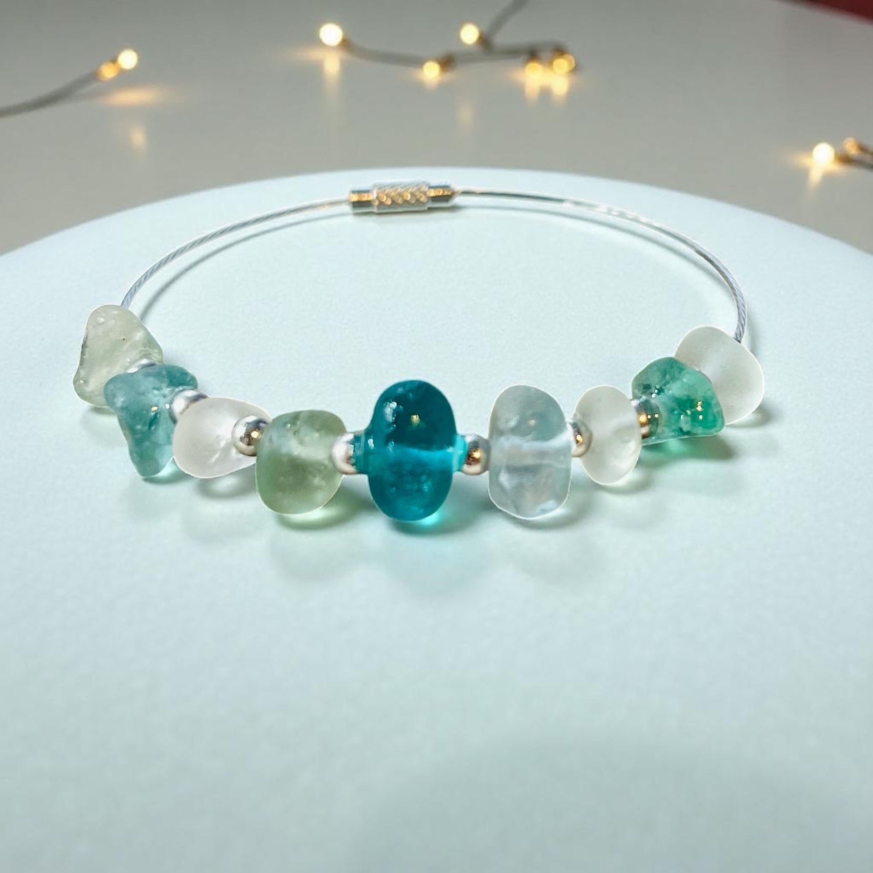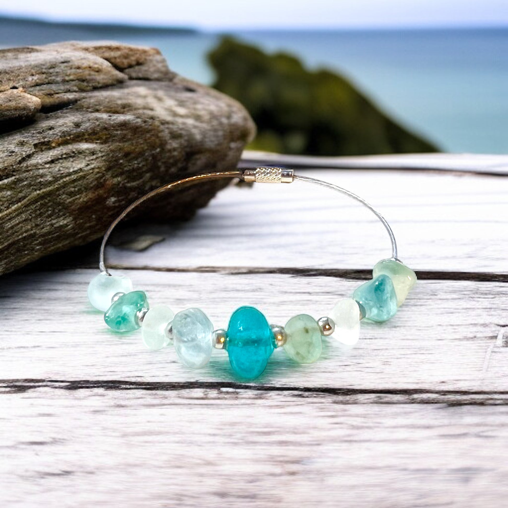 Drilled Sea Glass Bangle with Stainless Steel Bangle which has a screw style fitting . Stainless Steel Hypoallergenic .