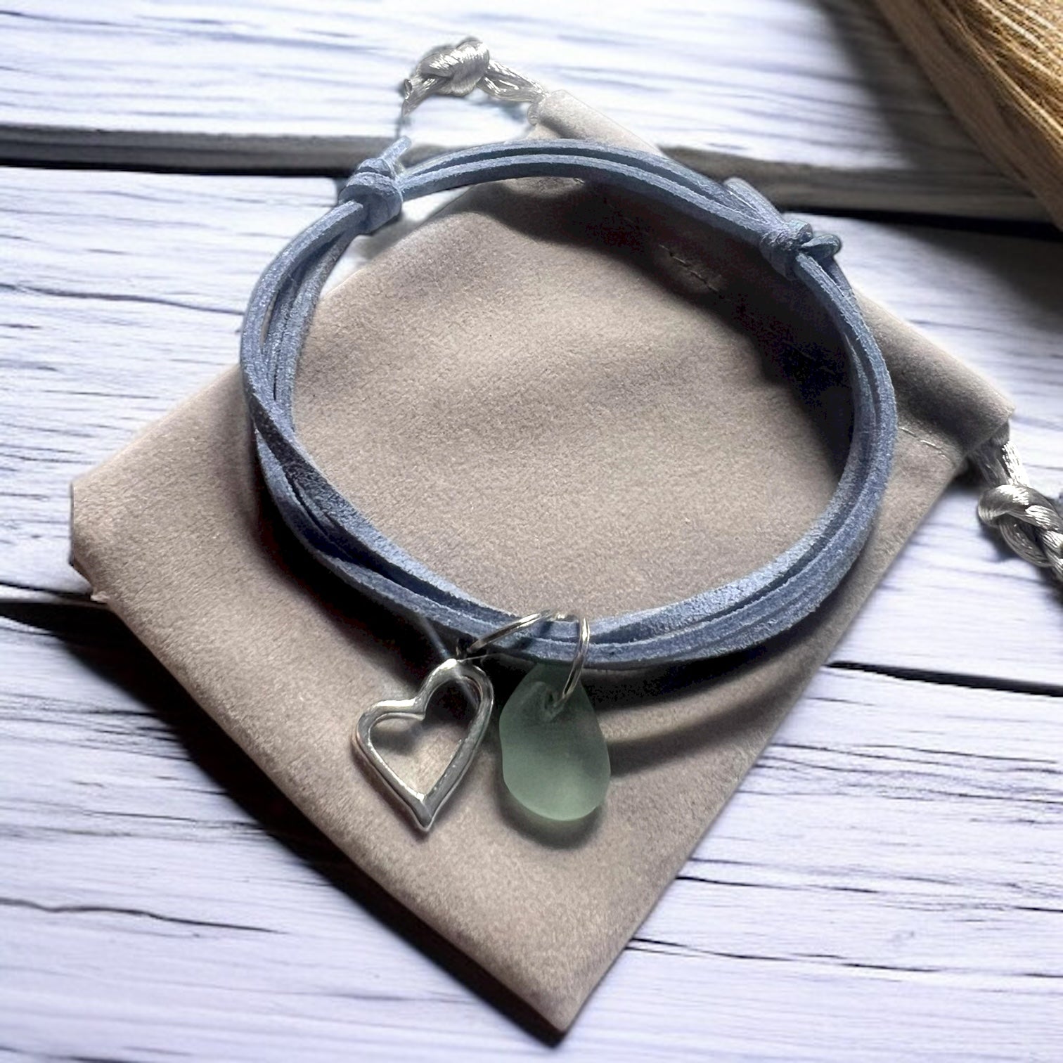 Sea Glass Heart Charm amd Sea Glass Suede Cord Bracelet