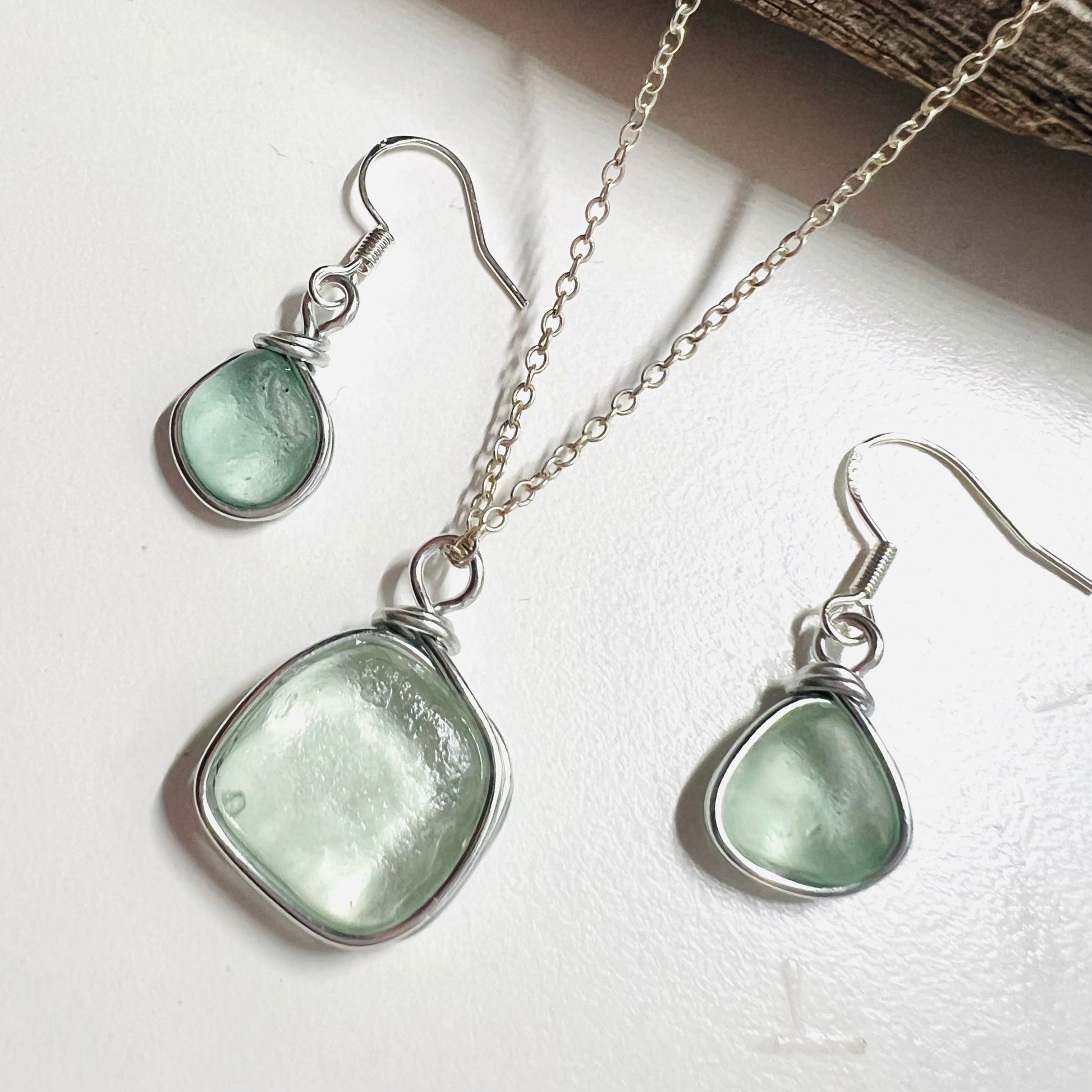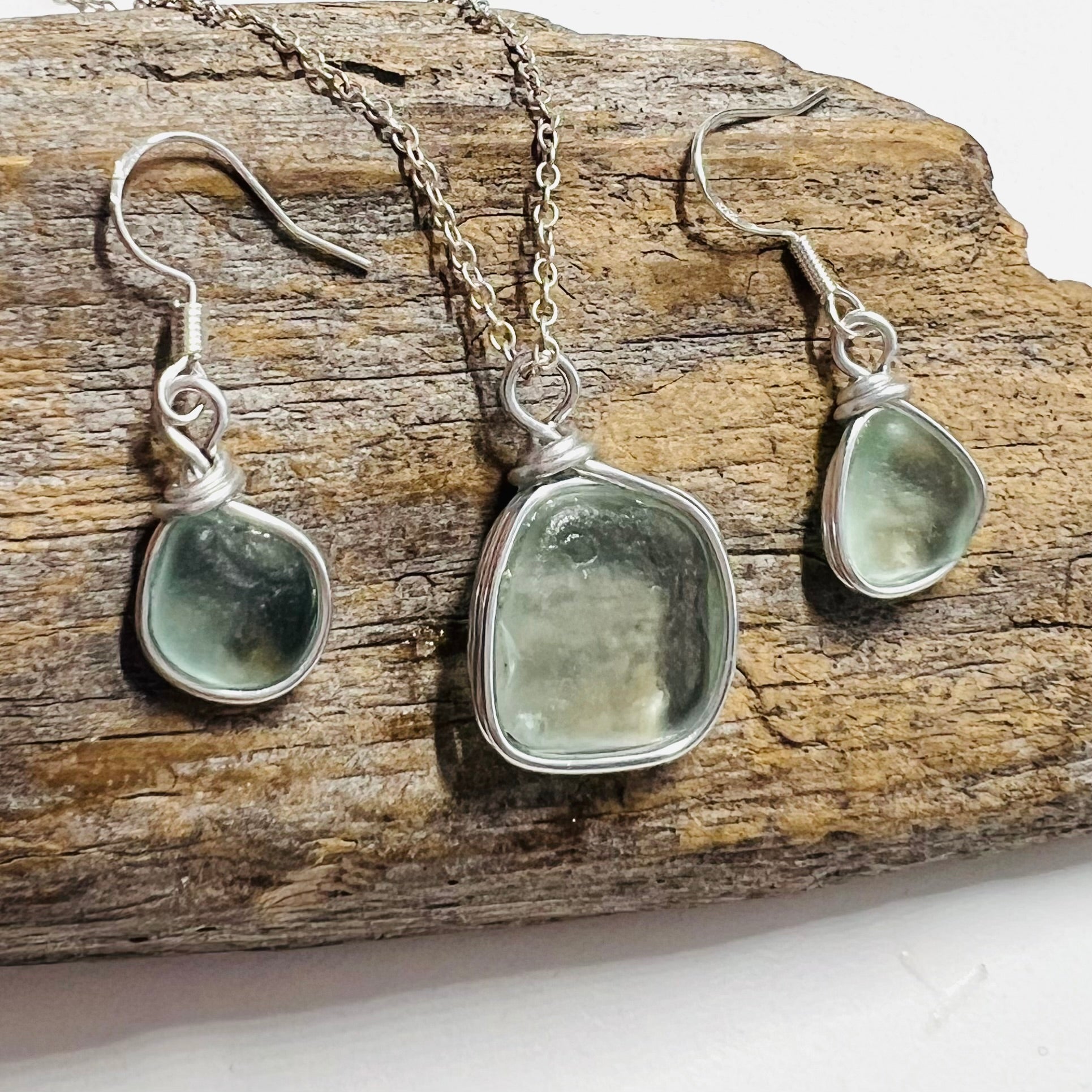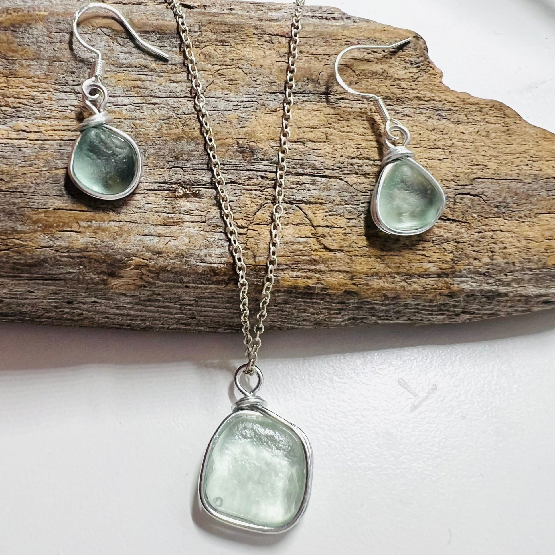 Gorgeous Seafoam Seaham Sea Glass Pendant on a 18” Sterling Silver Chain. Matching Sterling Silver Earrings .