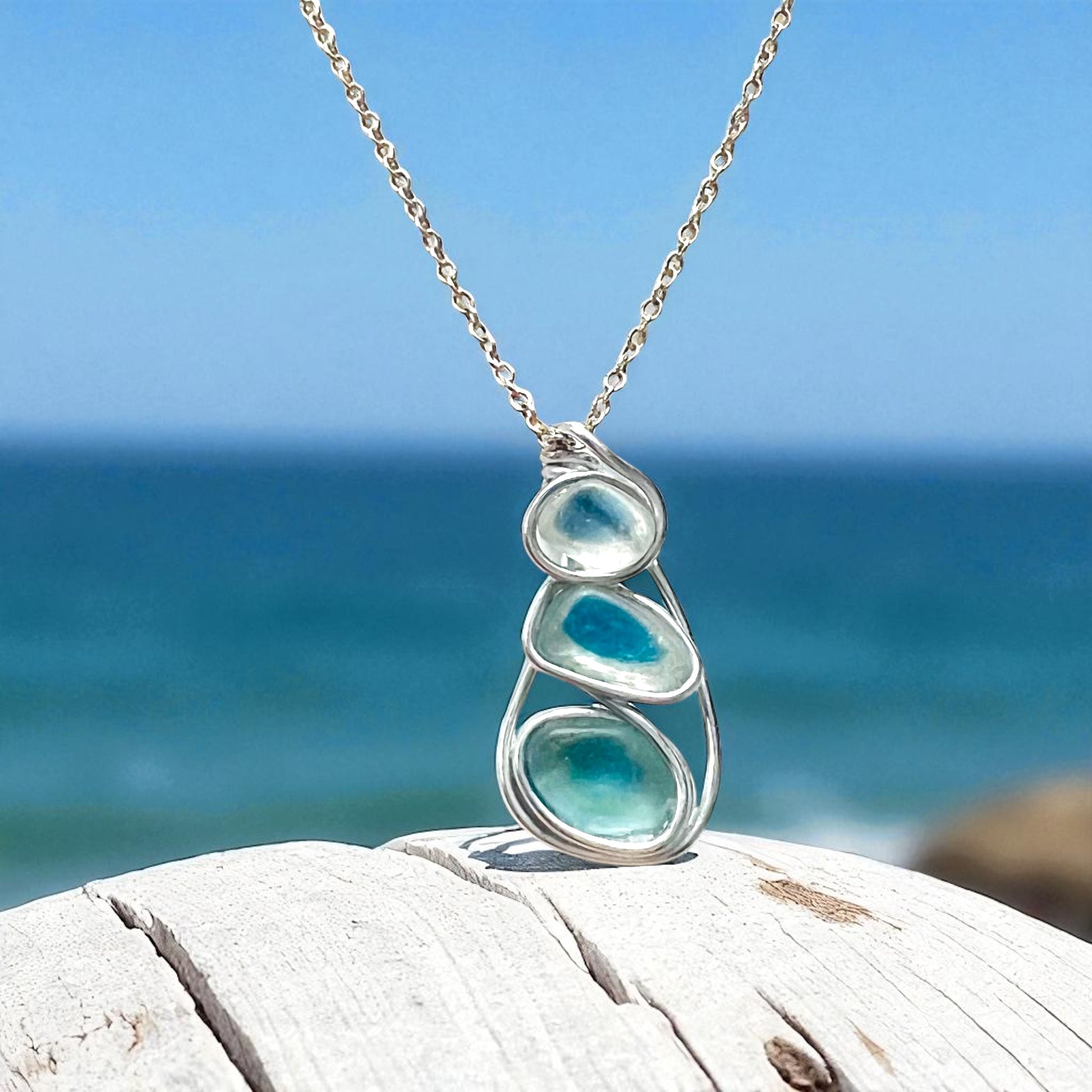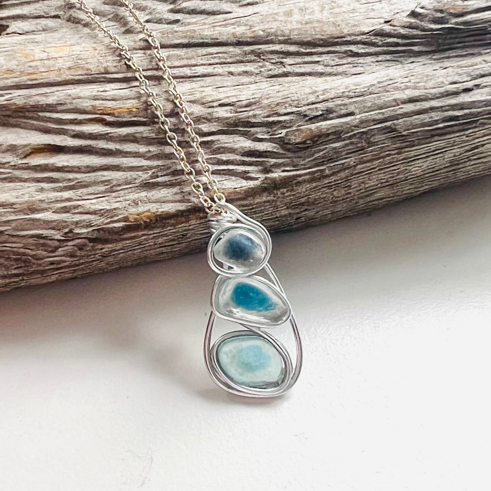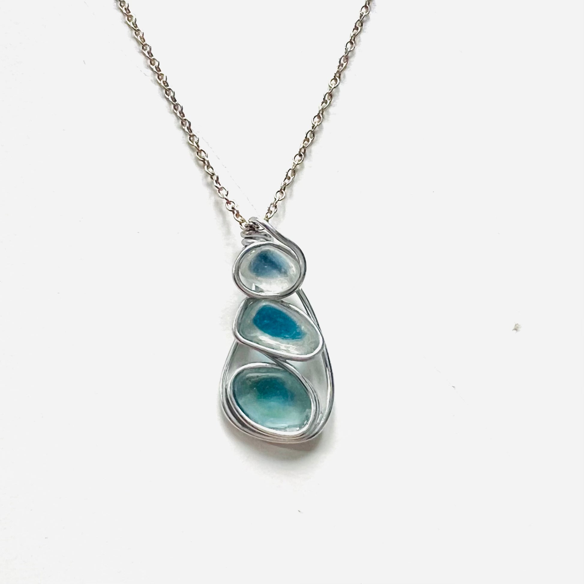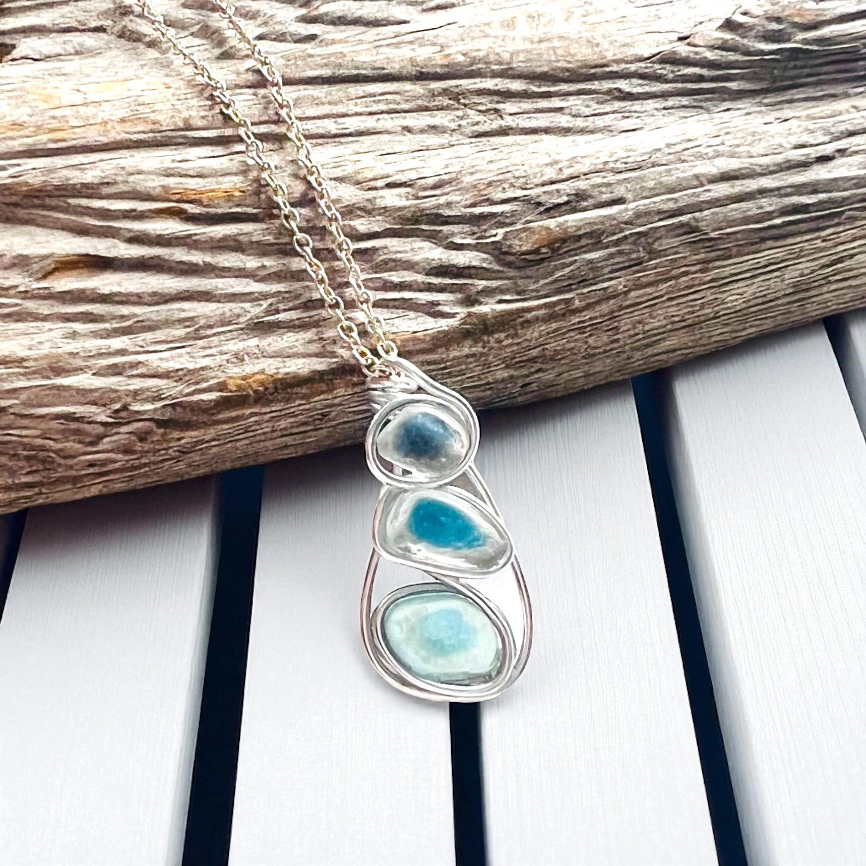 Seaham Sea Glass Three Piece Pendant. Handcrafted in wire and set onto a 18” Sterling Silver chain.