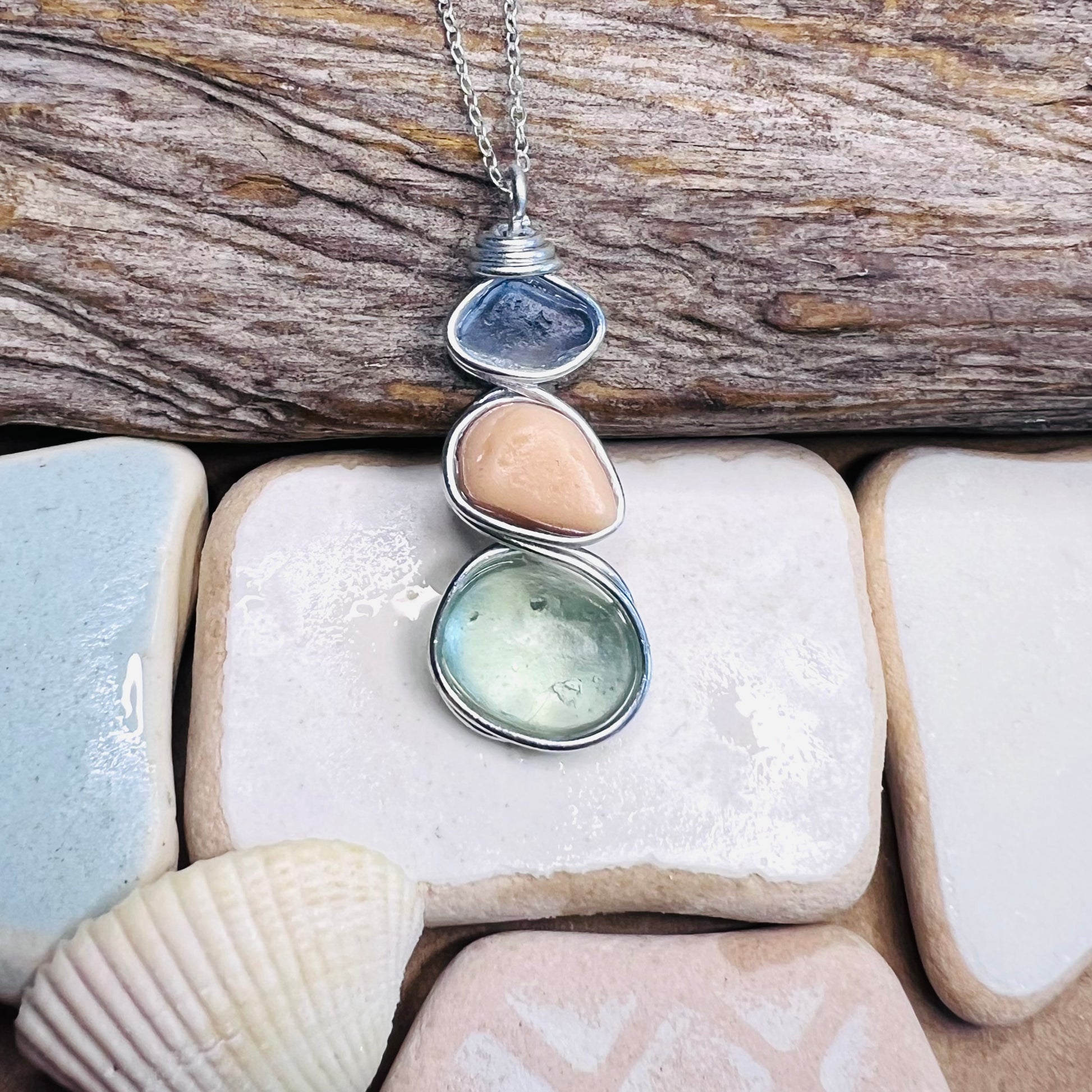 Seaham Sea Glass Three Piece Pendant. Handcrafted in wire and set onto a 18” Sterling Silver chain.