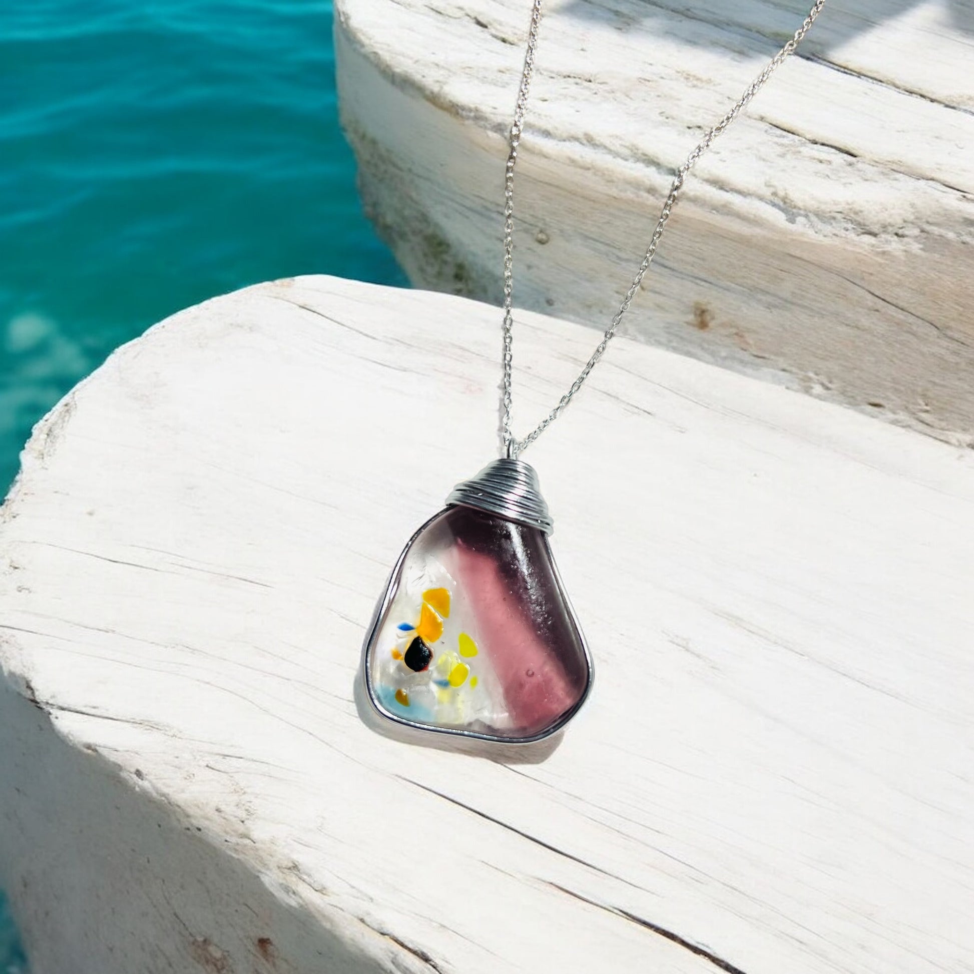 Very Large Multi Tone Sea Glass found in Italy from the Iberian Sea. Handcrafted in wire and set onto an 18” Sterling Silver Chain.